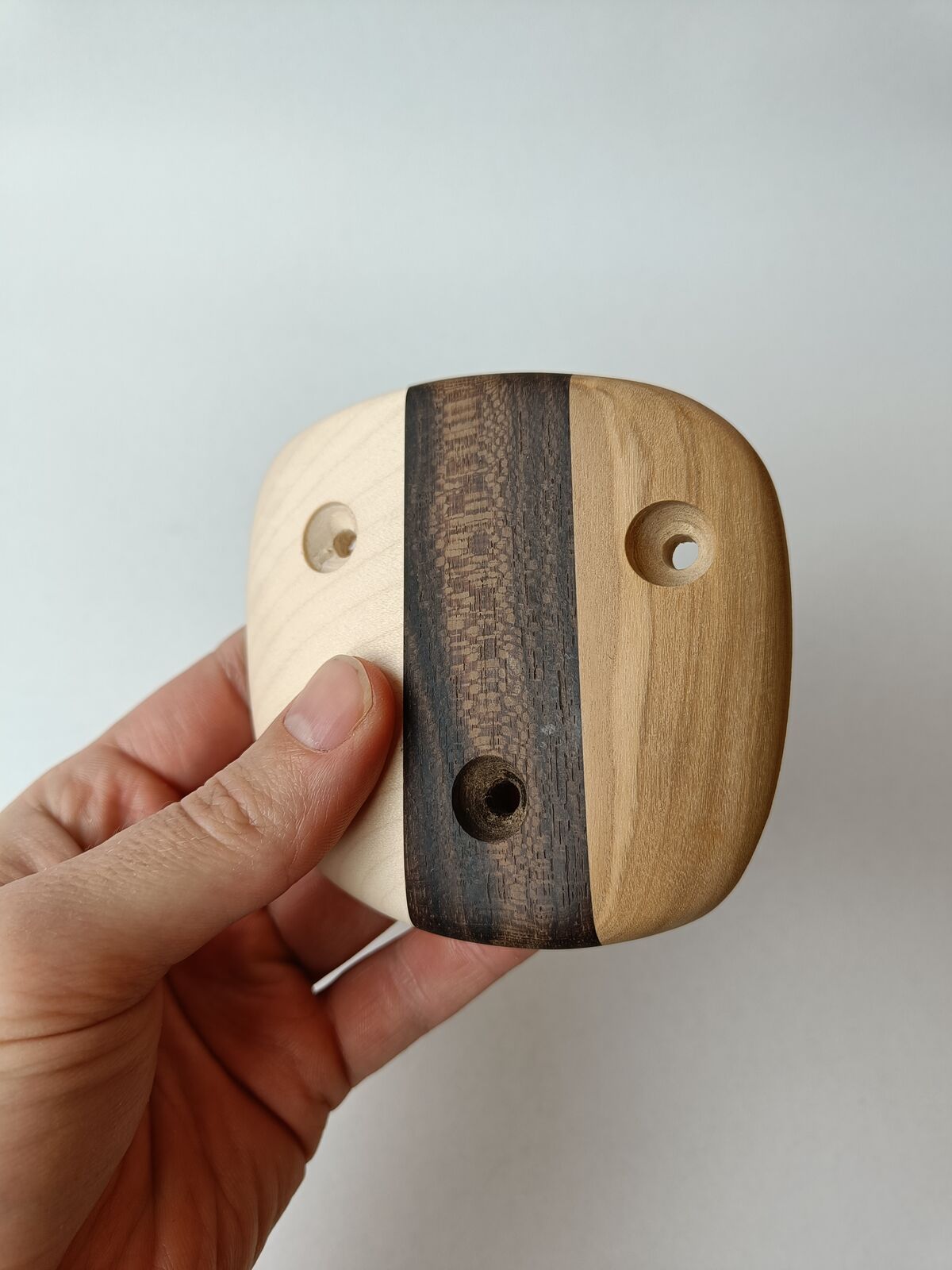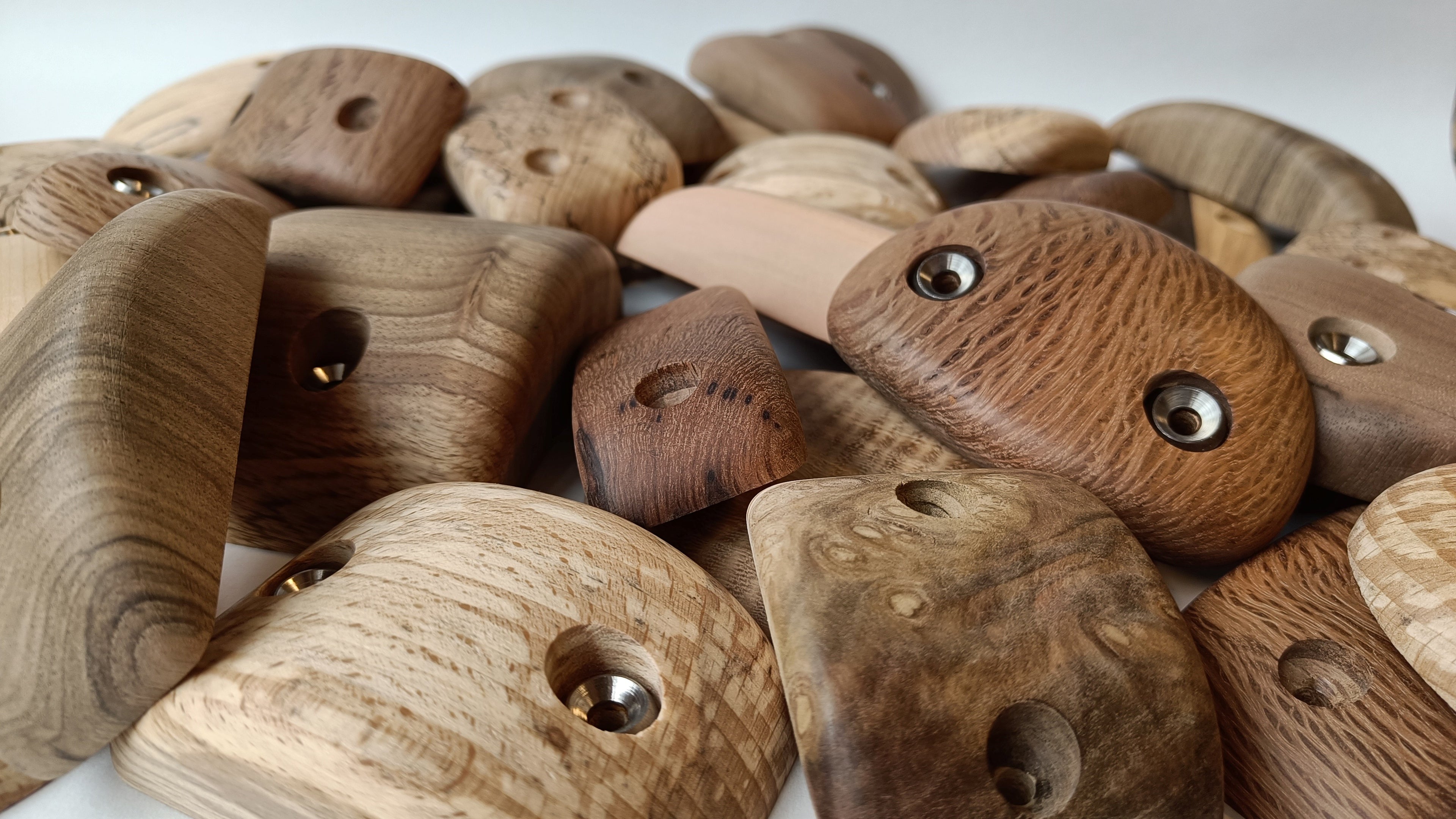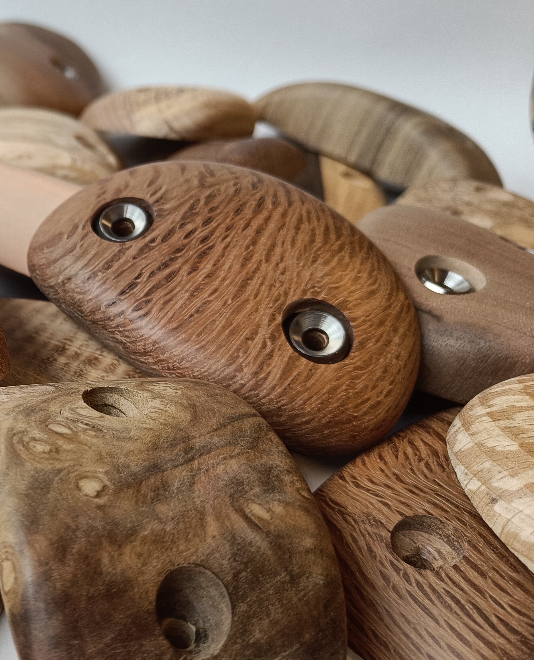 Unsere Klettergriffe entstehen in sorgfältiger Handarbeit – Stück für Stück. Verarbeitet werden ausschließlich ausgewählte Hölzer, die sich durch Stabilität, angenehme Haptik und natürliche Schönheit auszeichnen. Die individuelle Maserung macht jeden Griff zu einem Unikat: funktional, langlebig und ästhetisch.