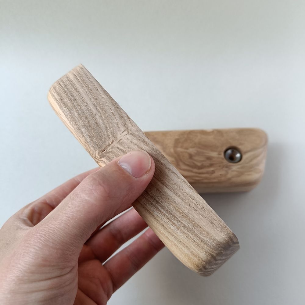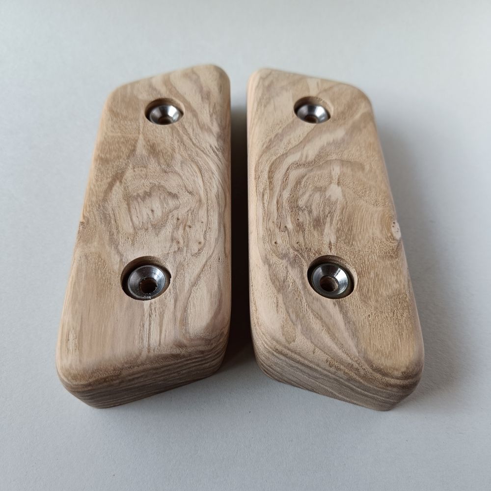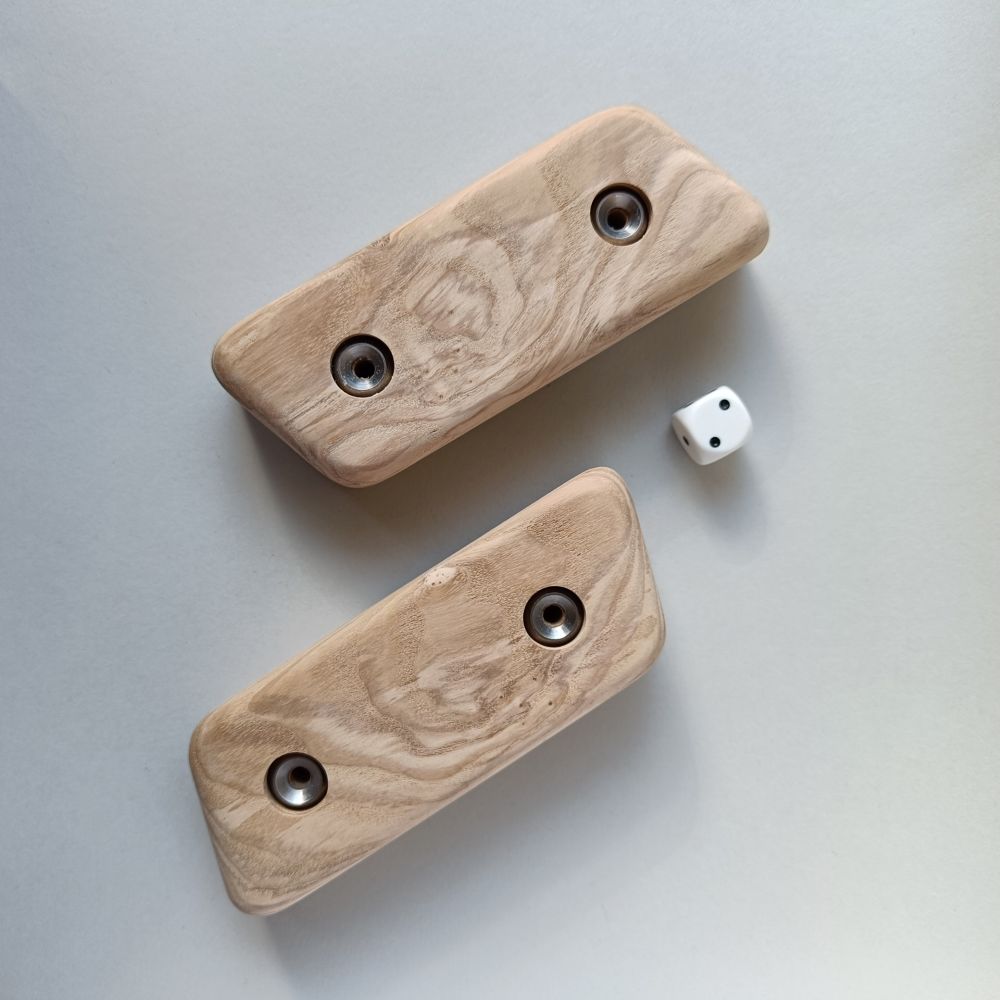 Symmetrical set of 2 holds, made of durable ash wood. The sides are angled by about 5 to 10 degrees.