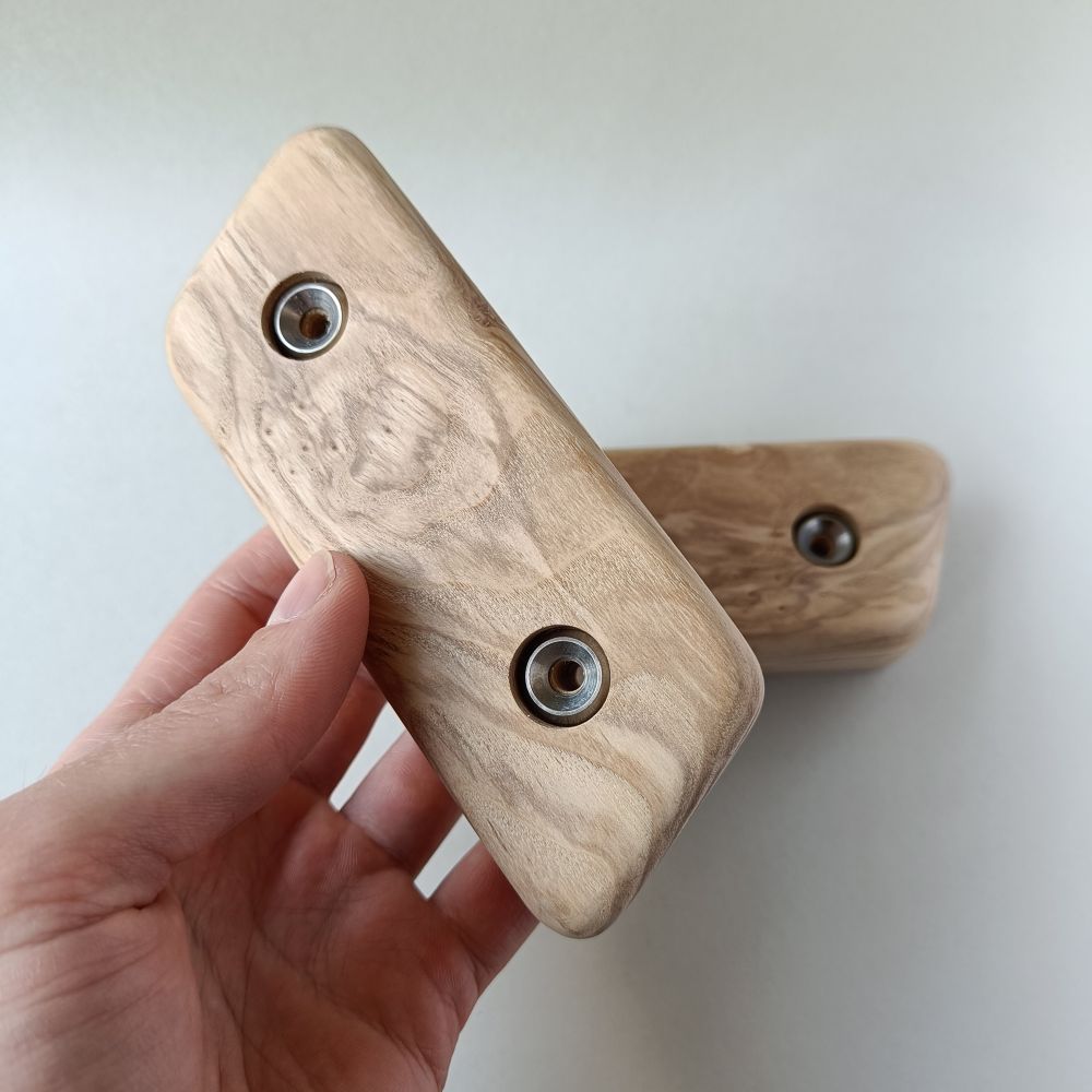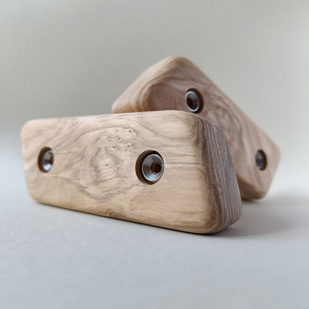 Our climbing holds are crafted from high-quality wood. Some have stainless steel rosettes to add extra protection, preserving the wood's appearance even with heavy use.