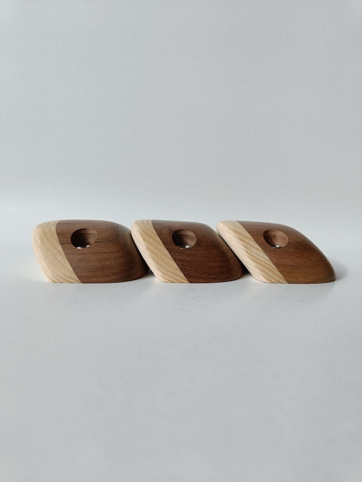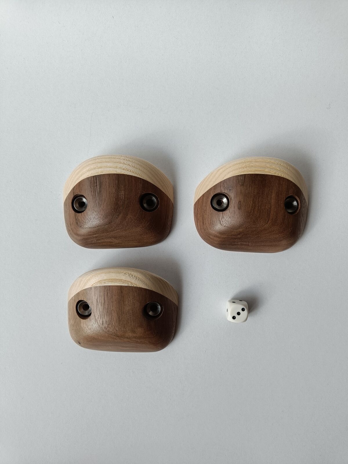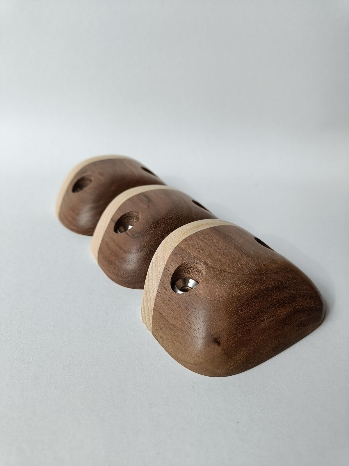 Set of 3 holds, made of durable ash and walnut wood. The edges are angled by about 40 degrees.