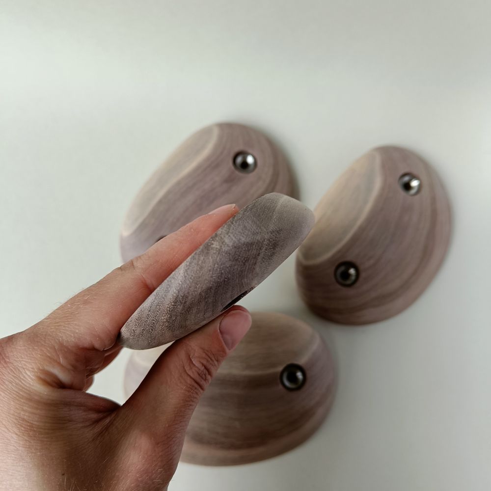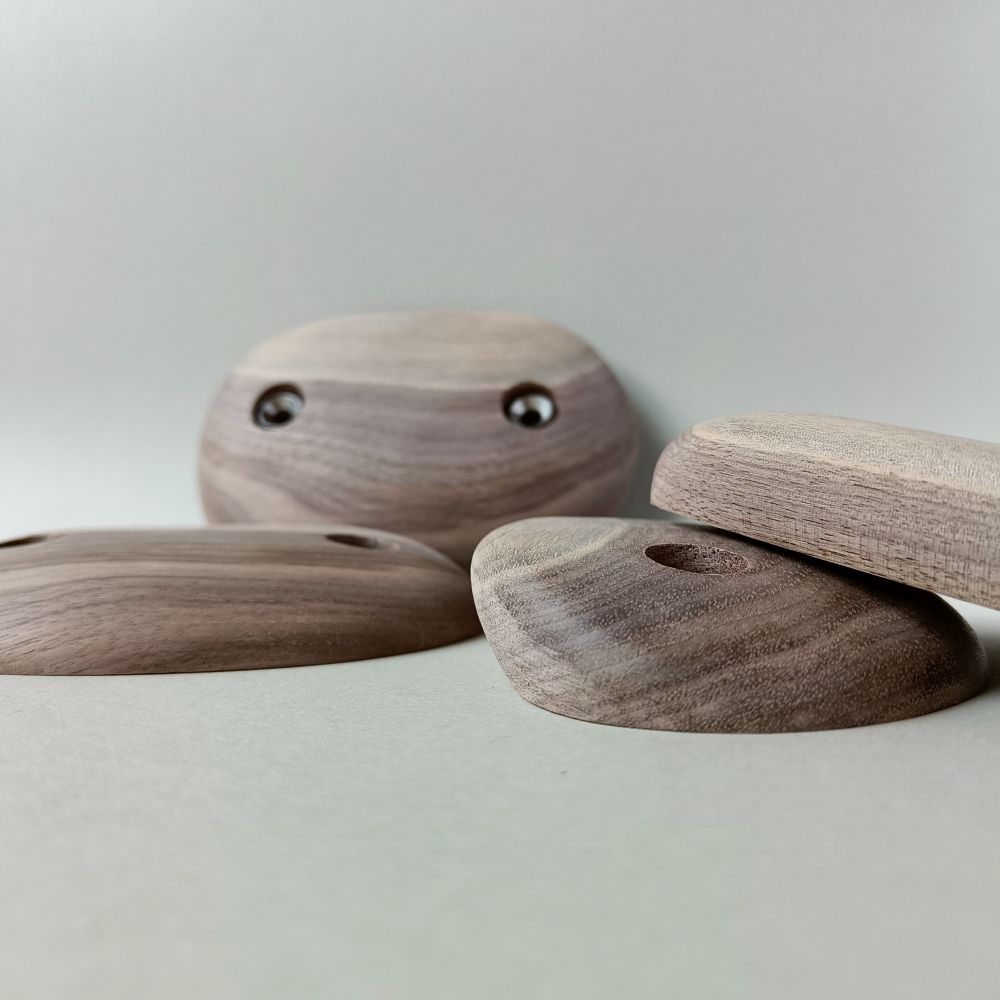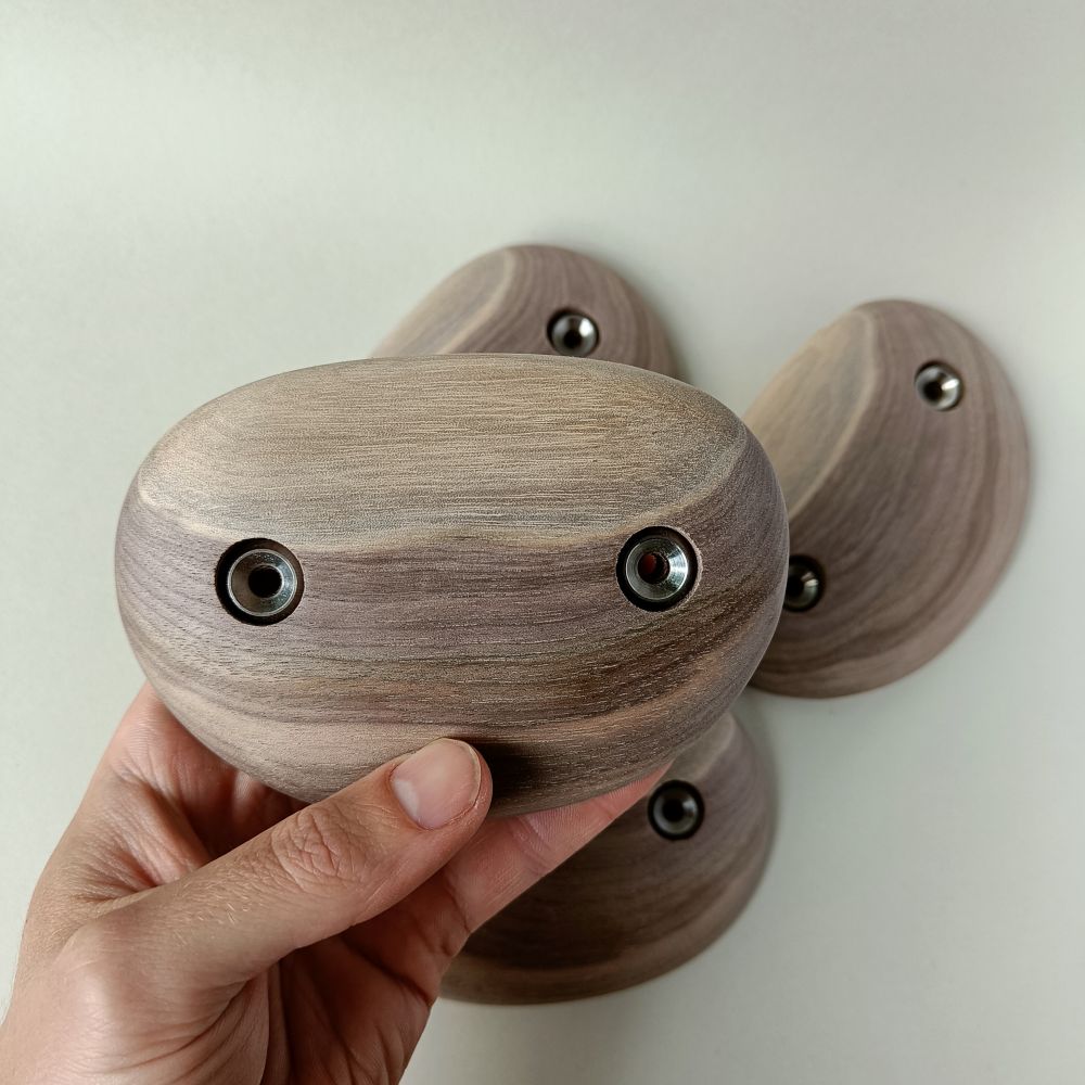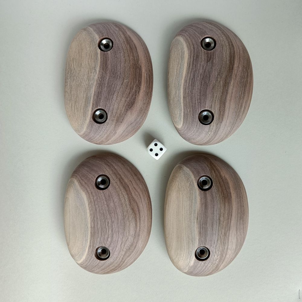 Set of 4 holds, made of durable walnut wood. The edges are angled by about 30 degrees.