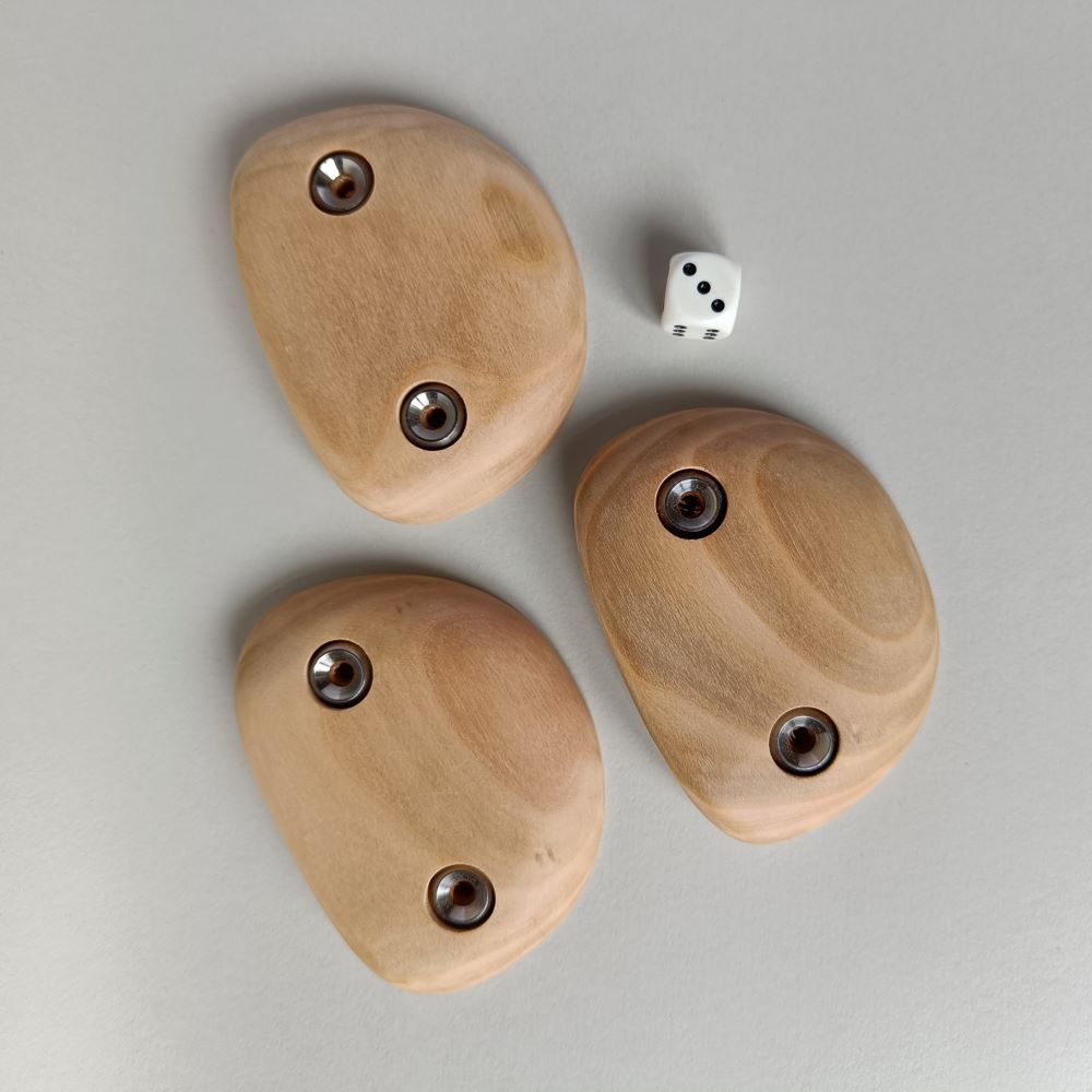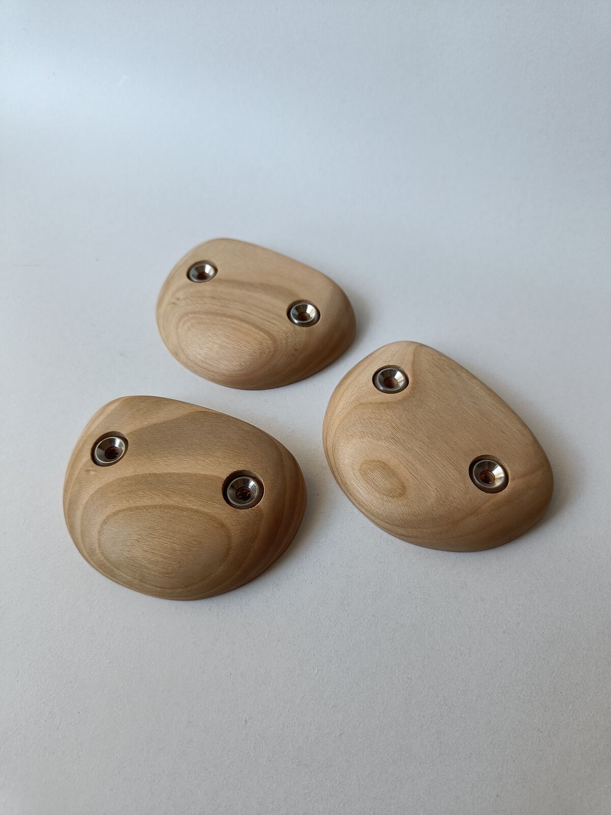 Set of 3 holds, made of durable cherry wood. The edges are angled between 20 and 30 degrees.