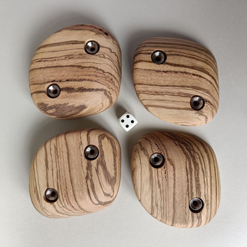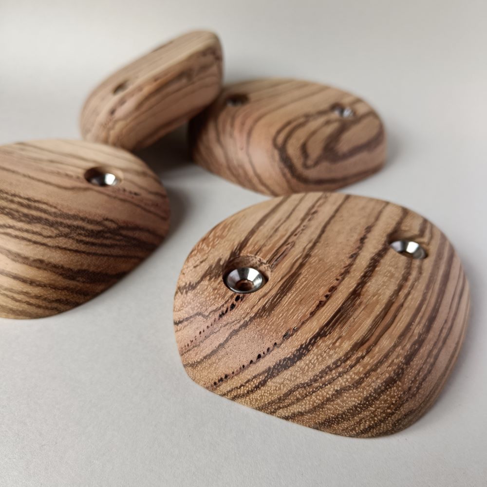 Set of 4 holds, made of zebrano wood. The edges are curved and angled by about 25 and 30 degrees.