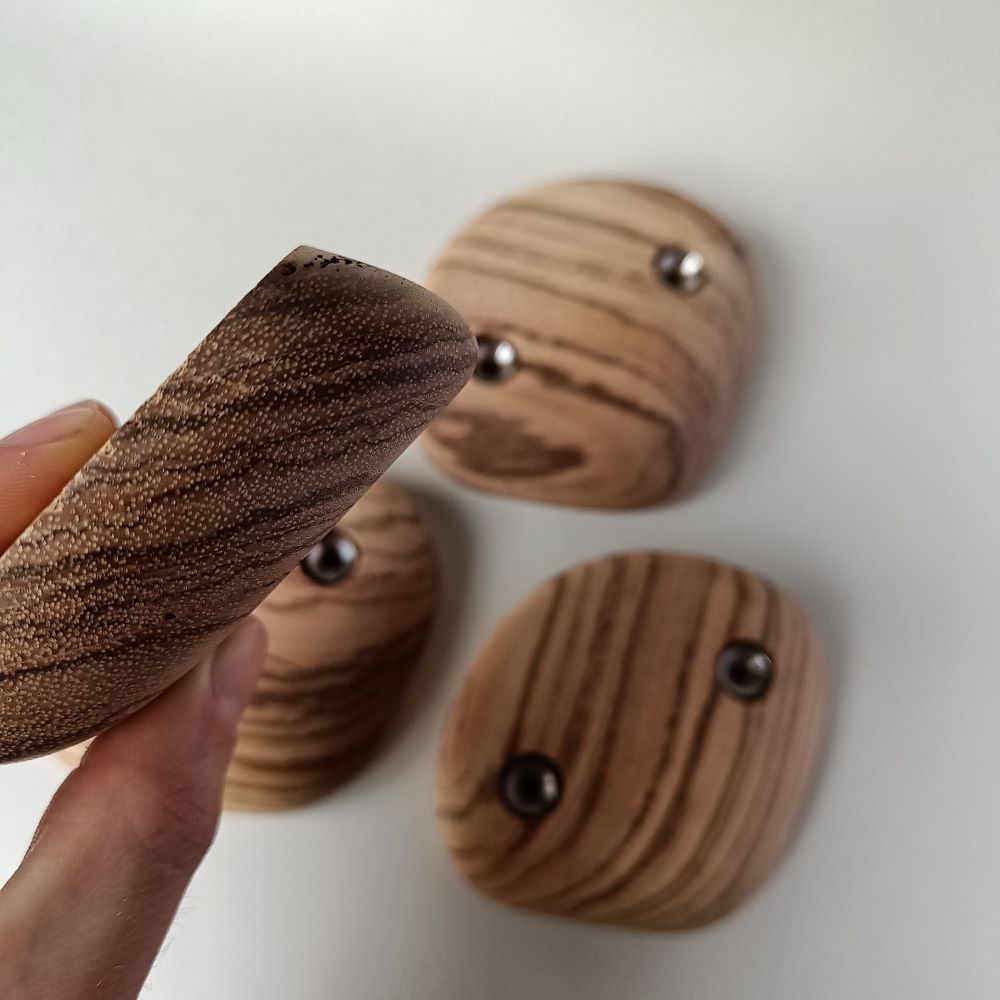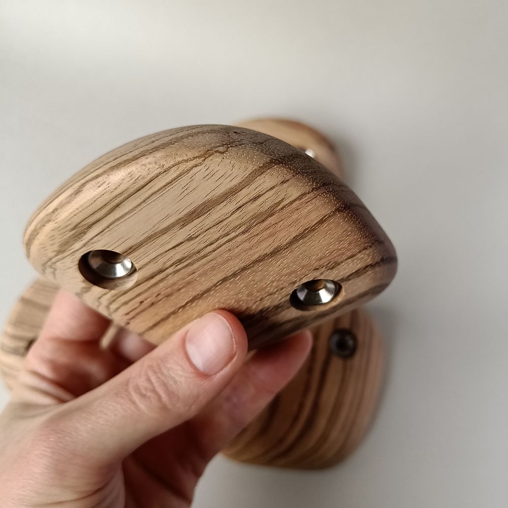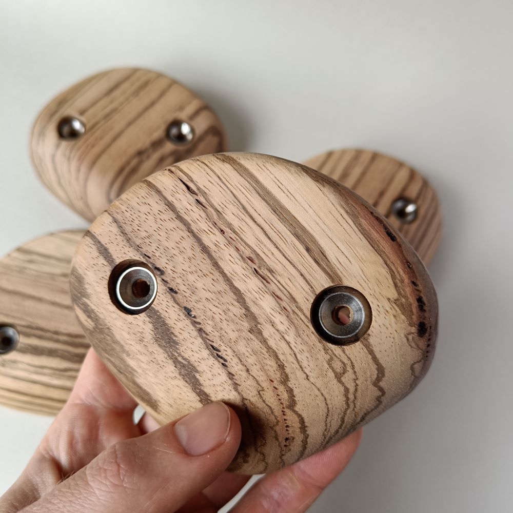 Our climbing holds are crafted from high-quality wood. Some have stainless steel rosettes to add extra protection, preserving the wood's appearance even with heavy use.