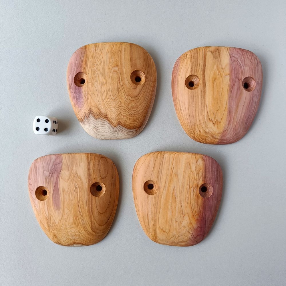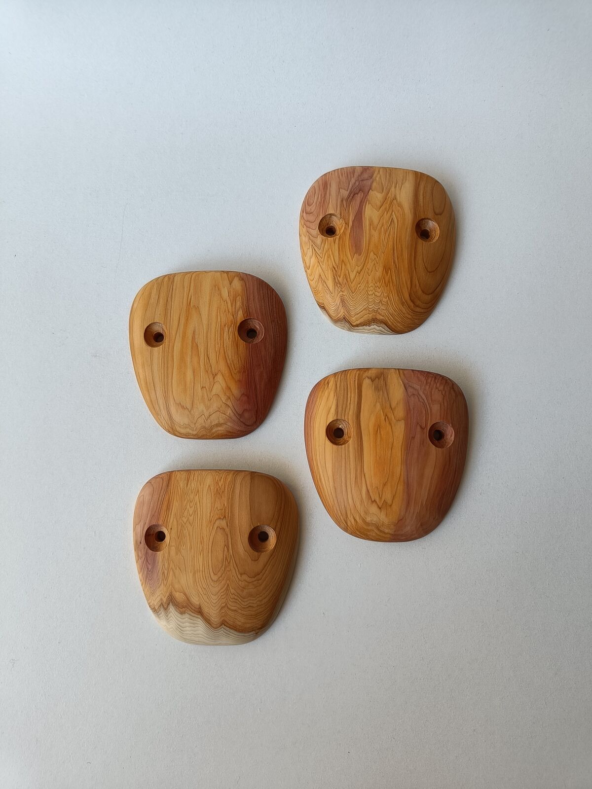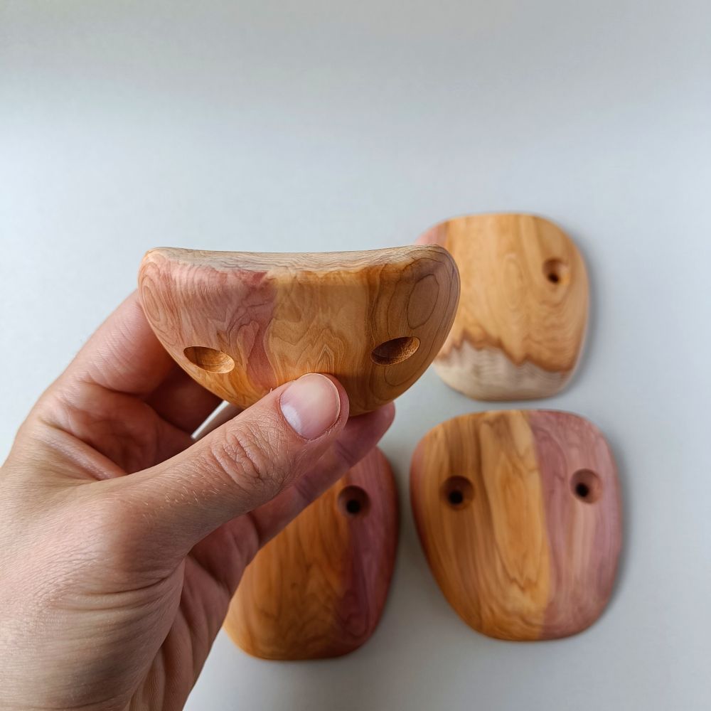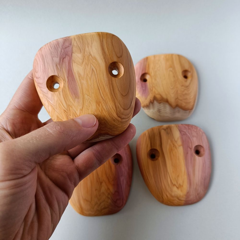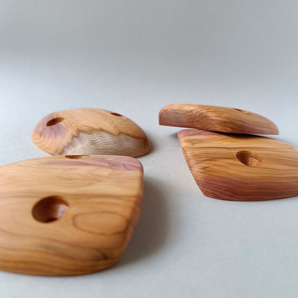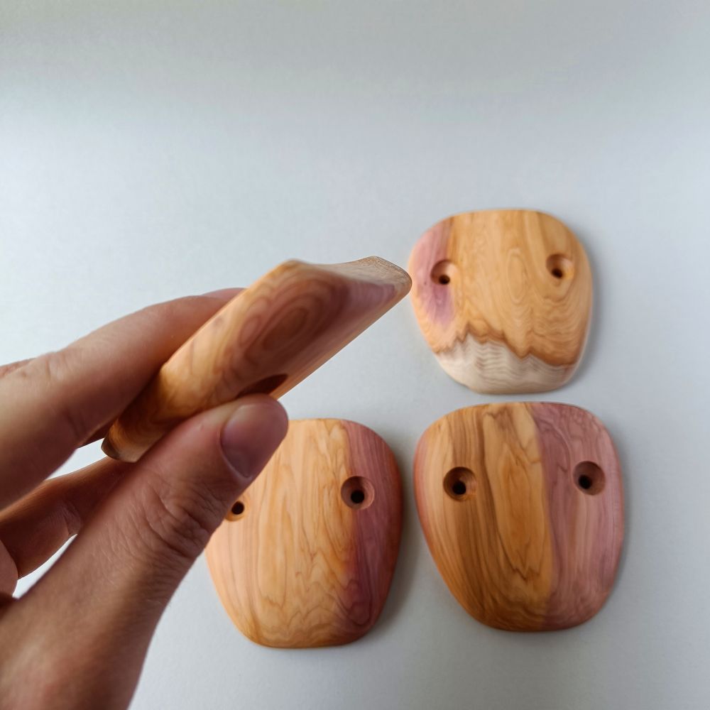 Set of 4 holds, made of european yew. The edges are angled by about 40 degrees.