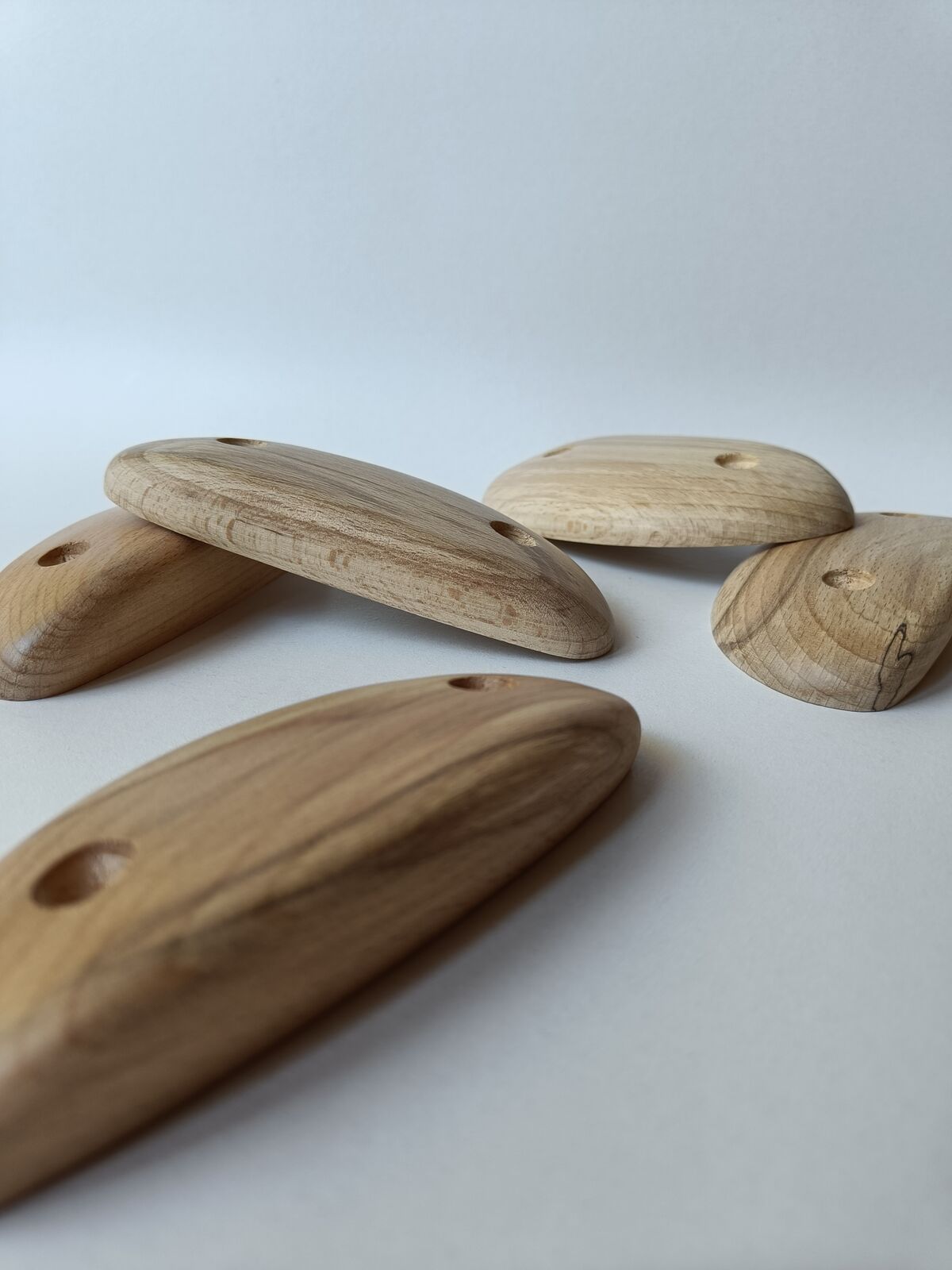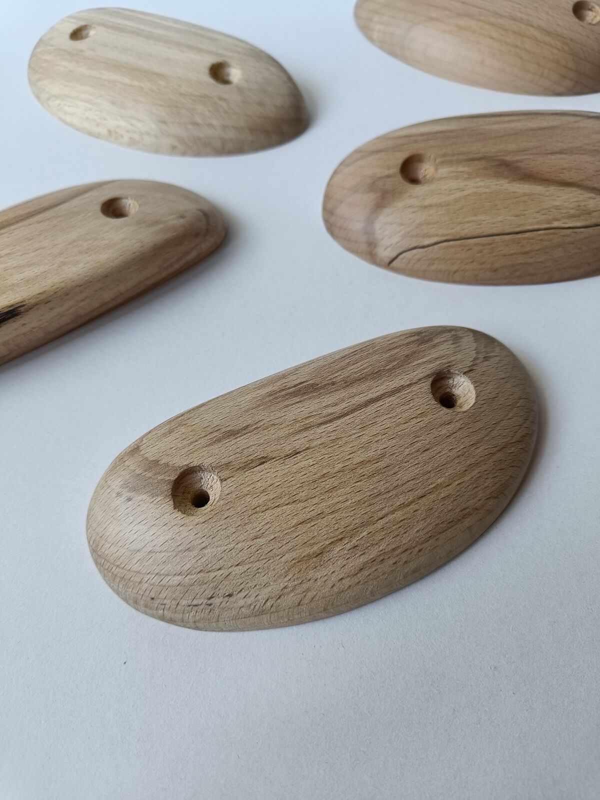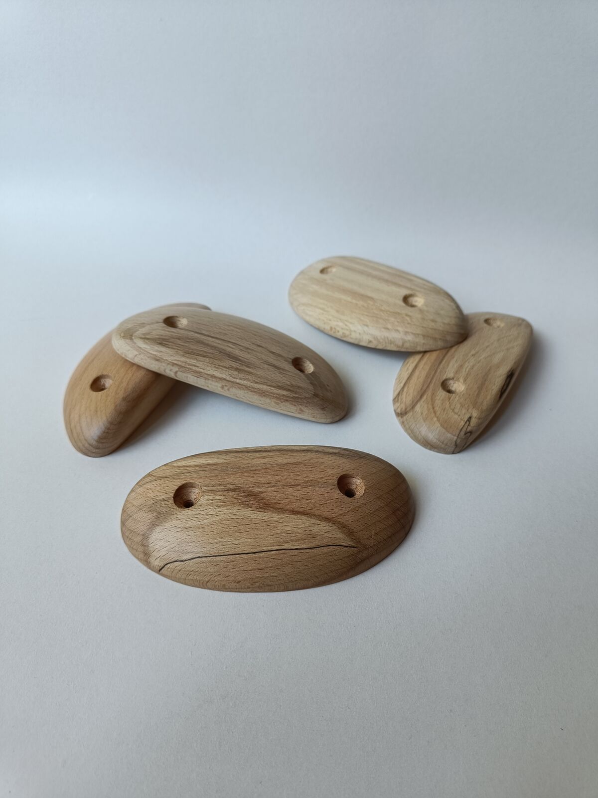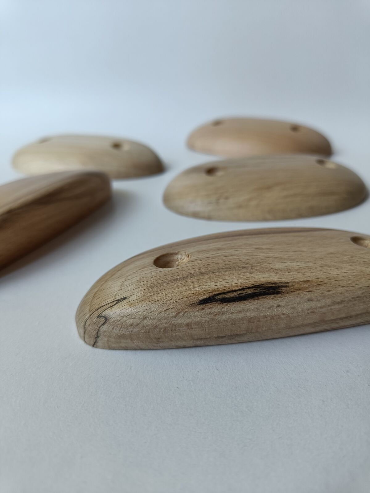 Set of 5 holds, made of beautiful spalted beech. The edges are angled by about 10 to 20 degrees.