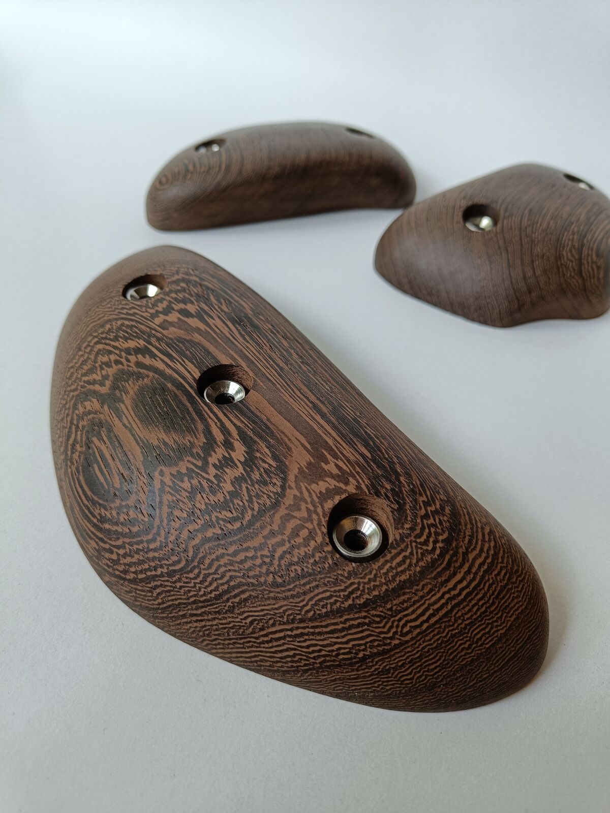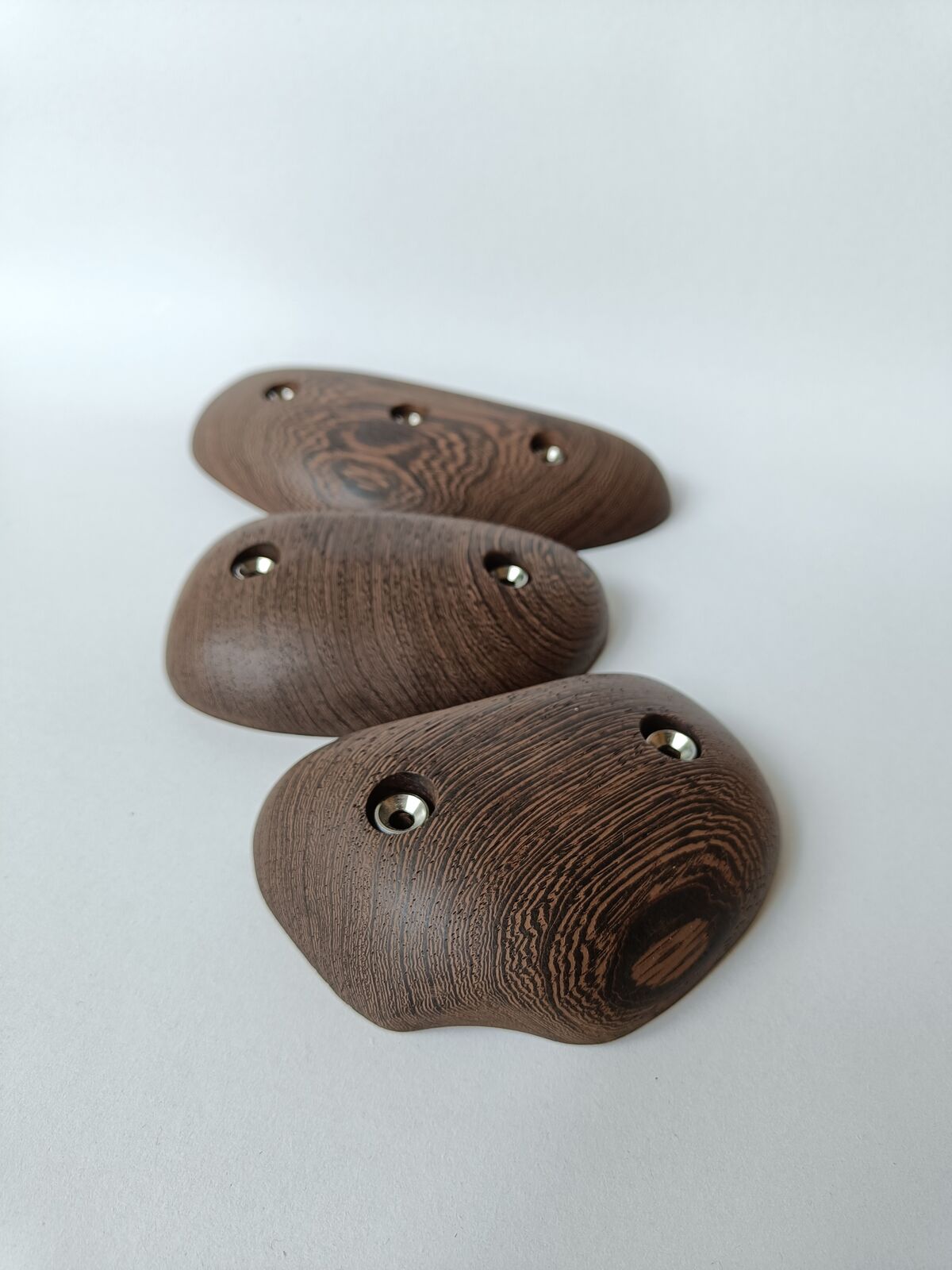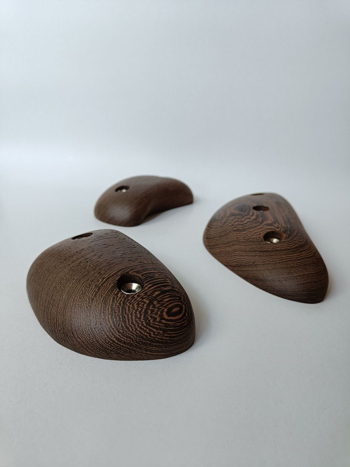 Set of 3 holds crafted of high-quality wenge. The edges are angled unevenly by about 10 to 35 degrees.