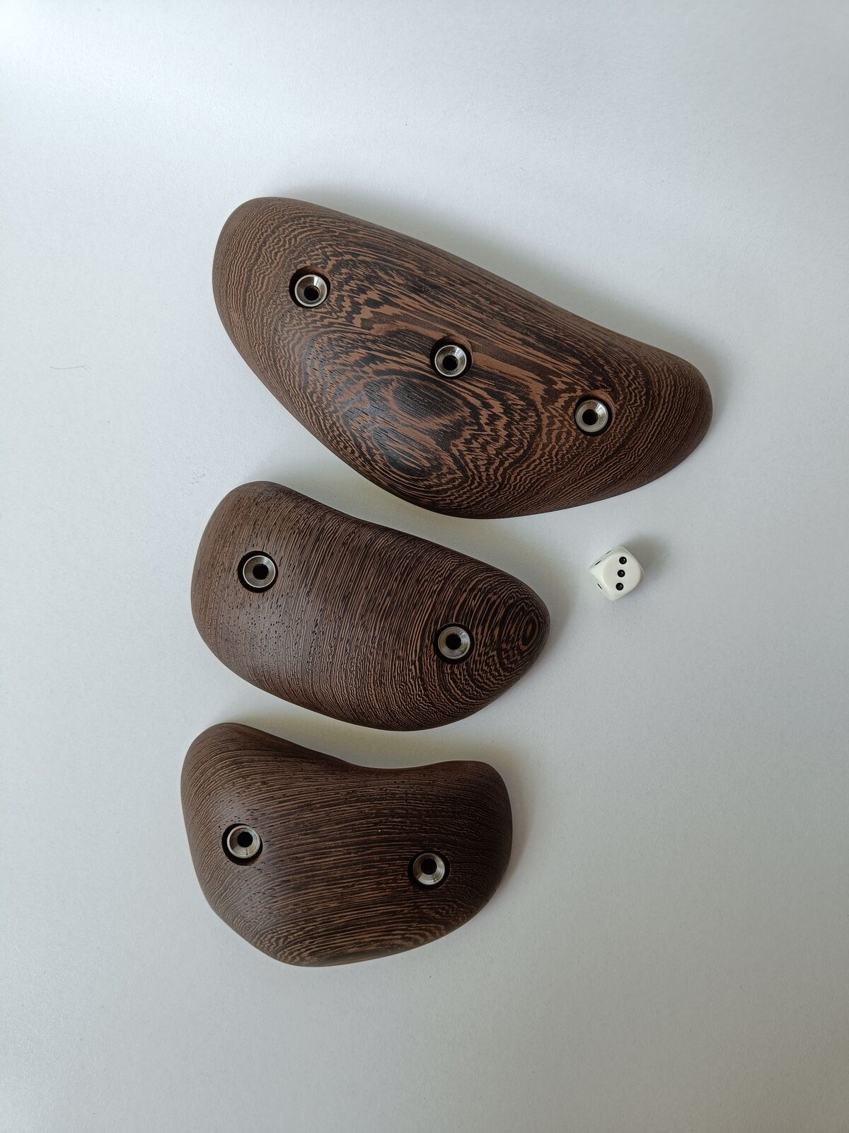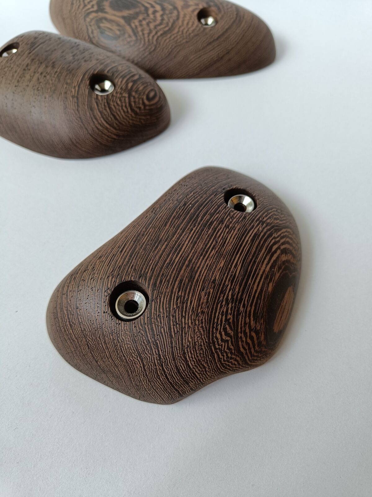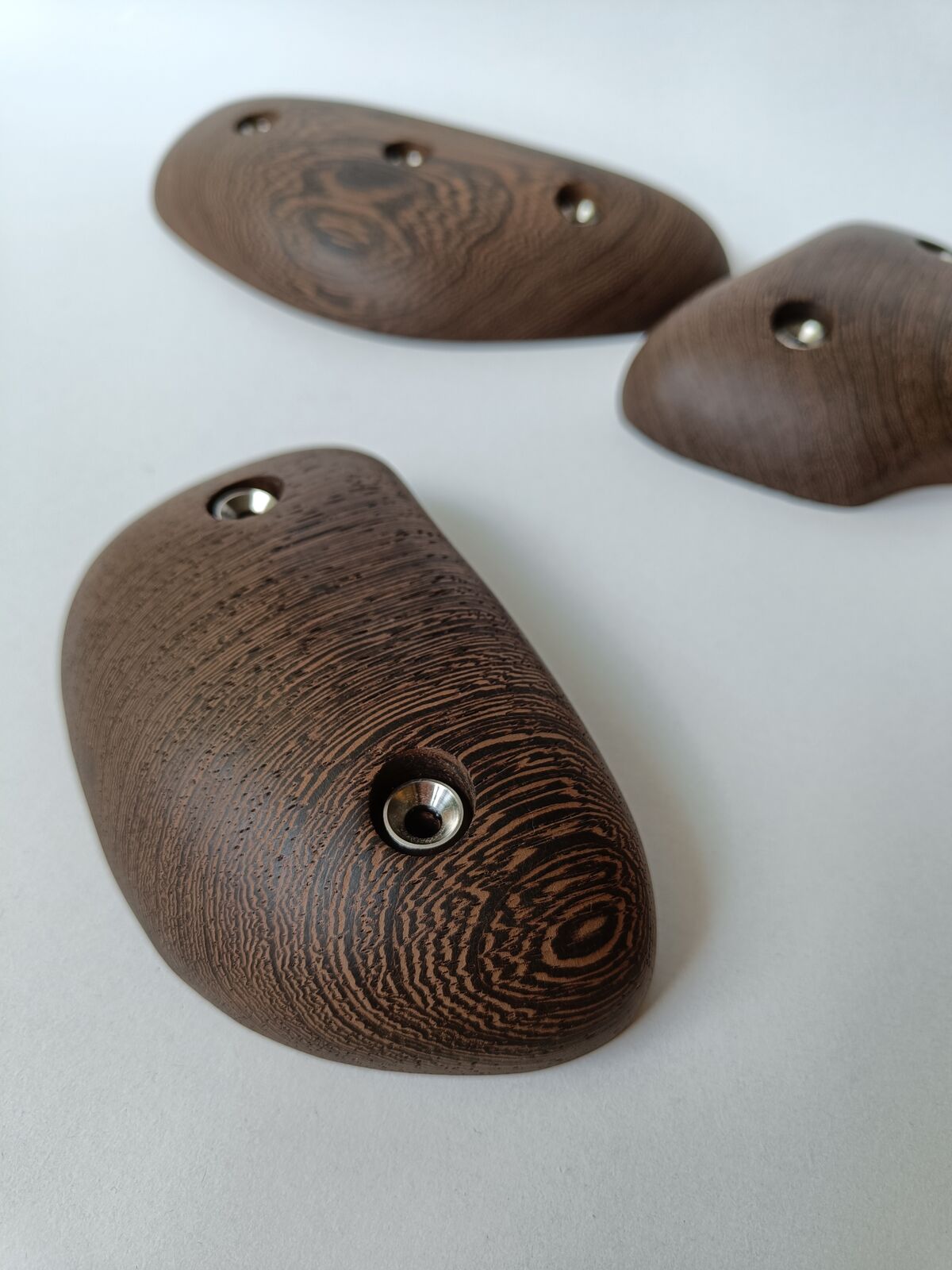 Set of 3 holds crafted of high-quality wenge. The edges are angled unevenly by about 10 to 35 degrees.