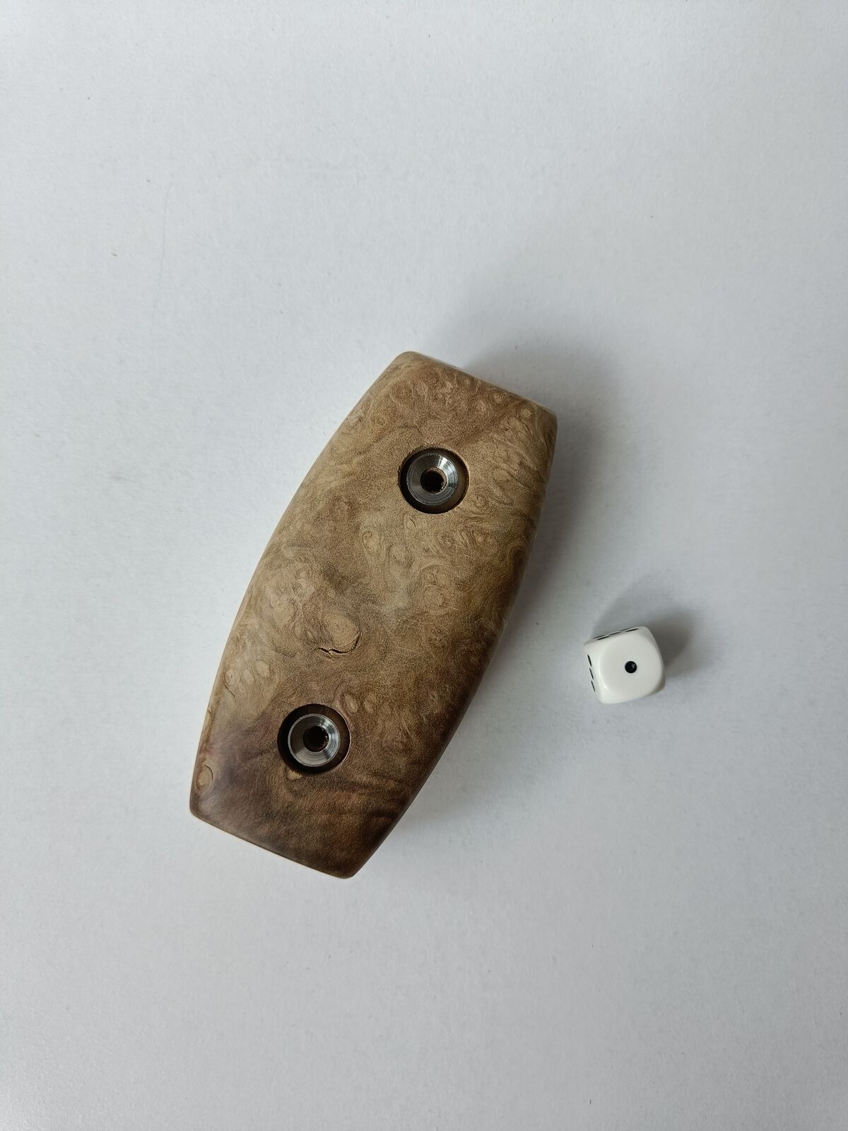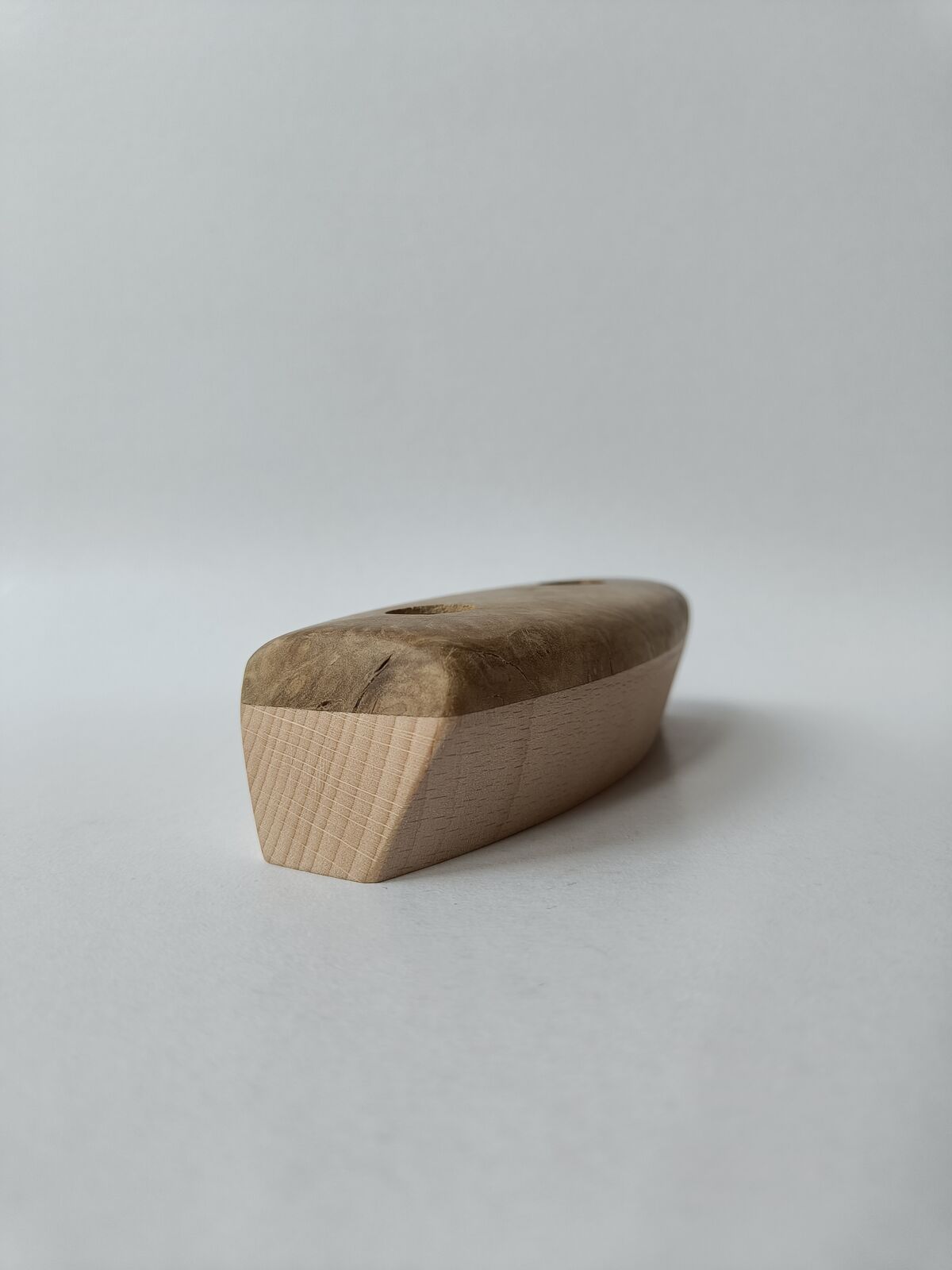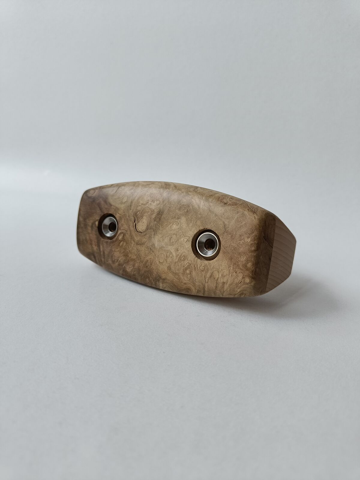 Einzelgriff, gefertigt aus Lorbeer Maser und Platane. Die Seiten sind in einem Winkel von etwa 15 Grad gearbeitet.